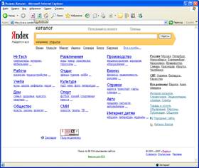 Яндекс.Каталог (http://yaca.yandex.ru/) предлагает поиск сайтов не только по теме, но и по другим признакам: региону, источнику и адресату информации, сектору экономики и т.д. Яндекс использует уникальный фасетный принцип построения каталога. Каталог Яндекса регистрирует сайты бесплатно, но такое включение может занять несколько месяцев. Чтобы попасть в списки каталога в течении 3 рабочих дней, коммерческие и некоммерческие сайты должны заплатить $249 и $49 соответственно, плюс НДС.