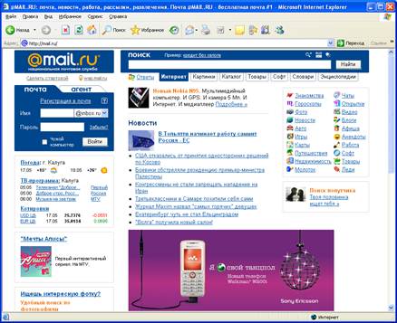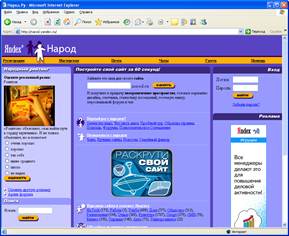 Один из самых популярных проектов Яндекса – Народ.Ру (http://narod.ru/) – служба бесплатного хостинга, а также мастерская для создания сайтов. С помощью инструментов Народа любой человек, совершенно незнакомый с интернетовскими языками разметки, может легко создать свое Web-представительство.