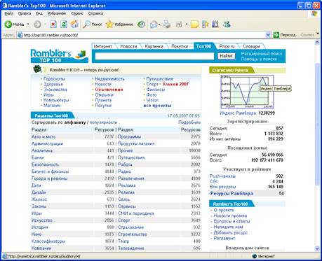 Рамблер (http://www.rambler.ru), в свою очередь, имеет две каталожные рейтинговые системы. Первая, Rambler's Top 100 (http://top100.rambler.ru/)- самый популярный русскоязычный рейтинг. Он действительно является очень хорошим траффикогенератором, но только если сайт попадет на первую страницу популярной категории. Если сайт имеет несколько крупных разделов, то имеет смысл регистрировать их отдельно, Рамблер это позволяет.