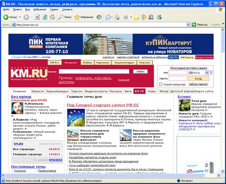 Следует также отметить интересный Интернет-проект KM.RU (http/www.km.ru/), разработанный компанией «Кирилл и Мефодий». Этот портал известен в Рунете как справочно-энциклопедический ресурс, предложивший пользователям сети интернет электронную версию энциклопедий «Кирилла и Мефодия» (MEGABOOK.ru - http://www.megaboobk.ru/).