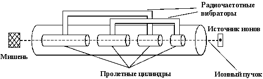 В кольцевых ускорителях, вдоль всего кольца, в котором, движутся разгоняемые заряженные частицы и из которых откачан воздух, стоят электромагниты. Чем сильнее магнитное поле, тем более энергичные частицы могут быть удержаны внутри кольца (камеры). Разгоняются частицы при помощи электрического поля в ускоряющих промежутках, которые расположены вдоль кольца. В кольцевом ускорителе, где частица может многократно пролететь вдоль кольца. пока не наберет нужную энергию, электрическое поле может быть не очень сильным. В линейном ускорителе (принципиальная схема которого приведена на Рис. 7), напротив, ускоряющие электрические потенциалы должны быть предельно высокими, потому что частица должна набрать всю свою энергию за один пролет. (Линейные ускорители используются также и для получения высокоэнергичных пучков ионов и ядер.)