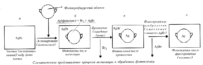 Таким образом, изображение заложено, но оно невообразимо слабое. При проявлении фотопленки (в полной темноте) под воздействием проявителя (водного раствора метола или гидрохинона) реакция восстановления засвеченного галогенида серебра до металлического резко усиливается, реагируют все молекулы засвеченного кристаллика, и образуются «большие», микронные зерна металлического серебра, а бром выводится в раствор (рис. в).