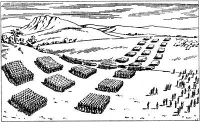 Предводитель войска, желавший битвы, не оставлял своих солдат у самых укреплений; напротив, он удалялся от них, другими словами, приближался к неприятелю, стараясь, однако, при этом не лишиться тех преимуществ, которые ему предоставляла данная местность, и из которых главное было – преимущество господствующей позиции. В том случае, например, когда он строил свое войско в боевой порядок впереди лагеря на склоне холма, он не уходил дальше нижней части этого склона, так чтобы неприятелю в любом случае пришлось пройти известную часть подъема, прежде чем начать нападение.