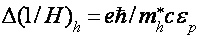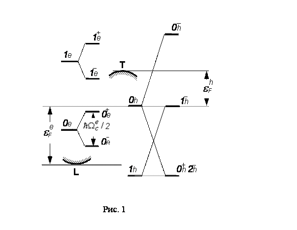 В работах (22-24) предложена модель, согласно которой осцилляции возникают в результате электрон-дырочных переходов между экстремумами подзон Ландау вблизи ферми-уровня. При этом циклотронные массы электронов и дырок должны быть кратны. В модификации данной модели (25) период осцилляций определяется комбинированной площадью
