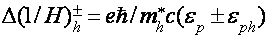 где последнее слагаемое связано со смещением края электронной зоны. В соответствии с (1), каждый раз, когда экстремум подзоны Ландау дырочной ветви спектра оказывается у дна зоны проводимости, частота столкновений испытывает скачок, связанный с обращением в нуль числа состояний электронной ветви спектра ниже дна зоны проводимости, т.е. возникают осцилляции кинетических коэффициентов с периодом (21,22)