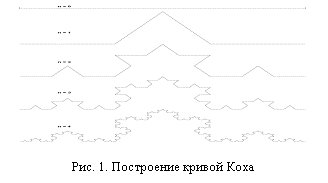 Классически, в литературе описание фракталов начинается с примера триадной кривой Гельгона фон Коха. Эта кривая строится итеративно. Построение начинается с прямолинейного отрезка единичной длины. На первом шаге исходный отрезок заменяется четырьмя длиной каждый в 1/3 от длины исходного. Далее, операция повторяется с каждым вновь полученным отрезком. Таким образом, получают кривую Коха разной детальности в зависимости от числа итераций