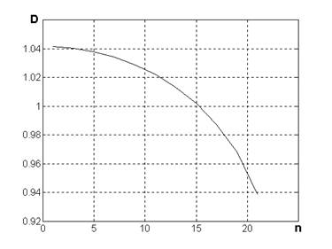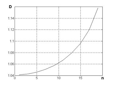 Проанализируем влияние численности структур, участвующих в формировании фрактального образования, на размерность Хаусдорфа этого образования. Пусть имеются несколько фрактальных образований. Первое строилось с помощью одной структуры, состоящей из j элементов. Второе – с помощью трех структур, состоящих соответственно из j-1, j и j+1 элементов. Третье – с помощью пяти структур, состоящих соответственно из j-2, j-1, j ,j+1 и j+2 элементов. И так далее. На рис. 2 построен график зависимости размерности Хаусдорфа от числа структур. Из рисунка видно, что, чем больше разнообразность структур, тем меньше размерность