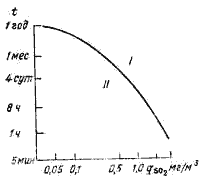 I – область значений концентраций SO2 и продолжительности воздействия, при которых установлено повреждение растительности; II – то же, при которых не установлено повреждение