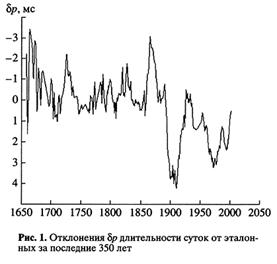 Скорость вращения Земли можно охарактеризовать отклонением длительности земных суток от эталонных, равных 86400 с. Чем короче земные сутки, тем быстрее вращается Земля. До создания очень точных атомных часов скорость вращения контролировалась благодаря сравнению наблюденных и вычисленных (в соответствии с небесно-механическими теориями) координат планет. Так удалось получить представление об изменении скорости вращения Земли в течение последних трех столетий (рис. 1). С начала XVIII до середины XIX в. скорость вращения Земли менялась мало. Со второй половины XIX в. по настоящее время наблюдаются значительные нерегулярные флуктуации угловой скорости вращения с характерными временами порядка 60-70 лет. Быстрее всего Земля вращалась в 1870 г., когда длительность суток была на 0.003 с короче эталонных, а медленнее всего - в 1903 г. (земные сутки были длиннее эталонных на 0.004 с). С 1903 по 1934 г. происходило ускорение вращения Земли, с конца 30-х годов до 1972 г. наблюдалось замедление, а с 1973 г. по настоящее время Земля ускоряет свое вращение. Колебание угловой скорости вращения Земли, наблюдавшееся в XX в. (с 1903 по 1972 г.) часто называют 60-70-летним. В XIX в. колебание примерно того же периода было зафиксировано с 1845 по 1903 г. В более раннюю эпоху 60-70-летние колебания не прослеживаются. К сожалению, данные XVII-XVIII вв. имеют низкую разрешающую способность, так как тогда интервалы времени между наблюдениями иногда достигали 29 лет.