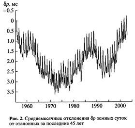 Точность определения неравномерности вращения Земли улучшилась в 1955 г. - после того как стали использоваться атомные часы. С этого момента появилась возможность регистрировать колебания скорости вращения Земли с периодами более одного месяца. Ход среднемесячных величин скорости вращения за период 1955-2000 гг. показан на рисунке 2. Скорость вращения Земли бывает наименьшей в апреле и ноябре, а наибольшей - в январе и июле. Январский максимум значительно меньше июльского. Разность между минимальной величиной отклонения длительности земных суток от эталонных в июле и максимальной в апреле или ноябре составляет 0.001 с.