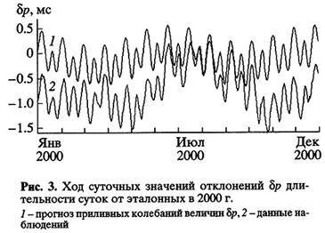 На рисунке 3 воспроизведен суточный ход значений отклонений длительности суток в 2000 г. Здесь, помимо сезонных изменений, обусловленных гидроме-теорологическими процессами, хорошо видны приливные колебания скорости вращения Земли. По величине размаха они немного уступают сезонным колебаниям, но их периоды в десятки раз короче сезонных (близки к 14 суткам).