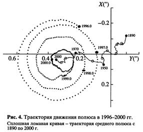 Изменяется не только угловая скорость Земли. Наша планета совершает небольшие колебания относительно оси вращения. Поэтому движутся точки, в которых ось пересекает земную поверхность (мгновенные полюса Земли). Они перемещаются по земной поверхности вокруг среднего полюса в направлении вращения Земли, то есть с запада на восток. Траектория движения полюса имеет вид спирали, которая периодически то закручивается, то раскручивается. Для примера на рисунке 4 показана траектория движения мгновенного Северного полюса за 1996-2000 гг. Его максимальное удаление от среднего отмечалось в мае-июле 1996 г. Затем полюс стал закручиваться, и это продолжалось до 2000 г., когда он подошел на минимальное расстояние к центру спирали. Сейчас полюс раскручивается и удаляется от своего среднего положения.