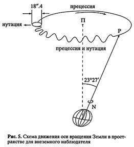 Ось вращения Земли медленно описывает конус вокруг перпендикуляра к плоскости эклиптики (рис. 5). Вершина конуса совпадает с центром планеты. Точки равноденствий и солнцестояний движутся по эклиптике навстречу Солнцу, совершая оборот за 26 тыс. лет (скорость движения -1° за 72 года).