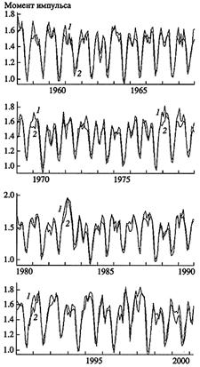 Момент импульса - это физическая величина, которая не может возникать или уничтожаться. Она способна лишь перераспределяться. В рассматриваемом случае перераспределение происходит между атмосферой и Землей. Когда момент импульса атмосферы увеличивается, то есть усиливаются западные ветры или ослабевают восточные ветры, момент импульса Земли уменьшается, то есть замедляется ее вращение. Когда же момент импульса атмосферы уменьшается (ослабевают западные или усиливаются восточные ветры), вращение Земли ускоряется. Степень согласия изменений момента импульса атмосферы и момента импульса Земли в 1958-2001 гг. показан на рисунке 6. Величины отклонений момента импульса Земли взяты с обратным знаком. Видно, что ход обеих кривых совпадает в пределах ошибок наблюдений. Так что суммарный момент импульса планеты и атмосферы остается неизменным.