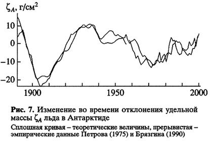 Исходя из этого можно составить систему алгебраических уравнений, связывающих величину скорости вращения Земли и координаты полюса с массами льда в Антарктиде, Гренландии и воды в Мировом океане. Эти уравнения позволяют вычислять характеристики вращения Земли - координаты полюса и скорость вращения Земли. Если же массы льда неизвестны, но имеются данные о нестабильностях вращения Земли, то можно решить обратную задачу: по координатам полюса и скорости вращения вычислить ежегодные значения масс льда в Антарктиде, Гренландии и воды в Мировом океане. К сожалению, мы не смогли сопоставить ряды вычисленных масс льда в Гренландии и воды в Мировом океане с данными наблюдений из-за отсутствия последних. Лишь для Антарктиды удалось сопоставить вычисленную кривую изменений массы льда с наблюденной (рис. 7). Качественное согласие кривых оказалось таким, что связь многолетней неравномерности вращения Земли с флуктуациями глобального во-дообмена кажется возможной. Однако вычисленные колебания глобального водообмена почти в 29 раз больше наблюдаемых.