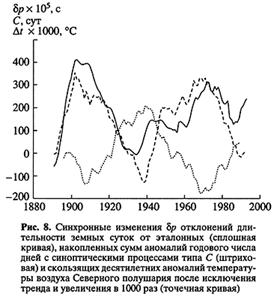 По десятилетним флуктуациям скорости вращения Земли можно следить и в какой-то степени прогнозировать колебания климата. Дело в том, что периоды ускорений вращения Земли (уменьшения длительности суток) совпадают с эпохами отрицательных аномалий частоты появления атмосферной циркуляции и положительных аномалий комбинированного типа атмосферной циркуляции. В эти периоды увеличивается масса льда в Антарктиде, ослабевает интенсивность зональной циркуляции, повышается темп роста температуры Северного полушария, преобладают положительные аномалии глобальной облачности, вырастают уловы промысловых рыб в Тихом океане (рис. 8). В периоды замедлений скорости вращения Земли масса льда в Антарктиде уменьшается, понижается темп роста глобальной температуры, отмечаются отрицательные аномалии глобальной облачности, снижаются уловы промысловых рыб в Тихом океане.