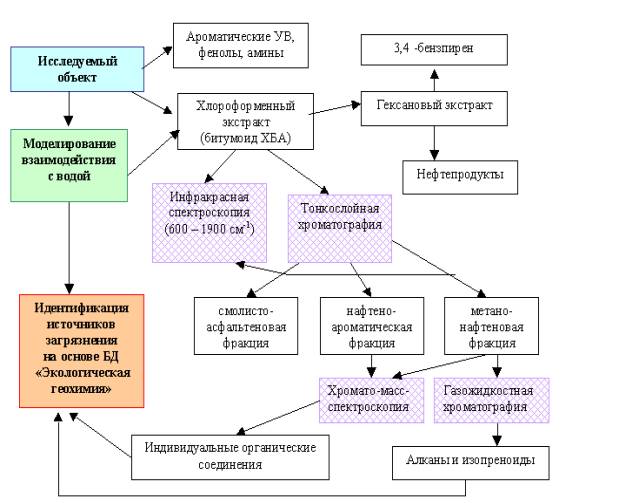 В связи с вышеизложенным, при оценке уровня органического загрязнения природных геосистем, наряду с контролем за концентрацией нефтепродуктов, производилось определение содержания битумоидов, извлекаемых хлороформом (ХБА), и исследование их состава методами инфракрасной спектроскопии (ИКС), тонкослойной (ТСХ) и газожидкостной (ГЖХ) хроматографии. Параллельно проводилось определение полициклической ароматики (3,4-бензпирен), а в водах и водных вытяжках - летучих фенолов. Общая схема анализа приведена на рис.1.