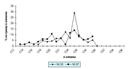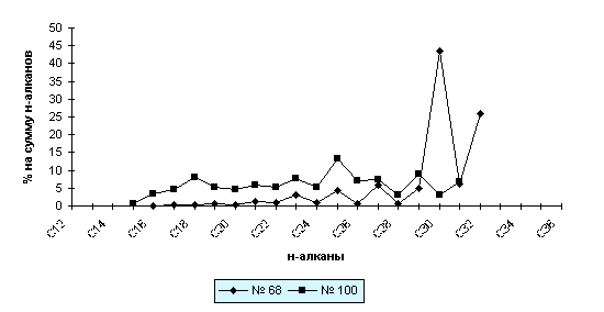 Песчаные отложения характеризуются более низким уровнем содержания битумоидов (в среднем 1.43 г/кг). Битумоиды почво-грунтов, особенно торфяники, характеризуются значительной окисленностью: содержание смолисто-асфальтеновой фракции колеблется в пределах 52-90%, а доля нефтепродуктов в составе ХБА не превышает 10-14%. По данным ГЖХ в составе битумоидов отмечается преобладание высокомолекулярных н-алканов С24-34 - 55-93% (в отдельных пробах торфа на углеводороды С30, С32 приходится до 69% н-алканов) (рис.3).