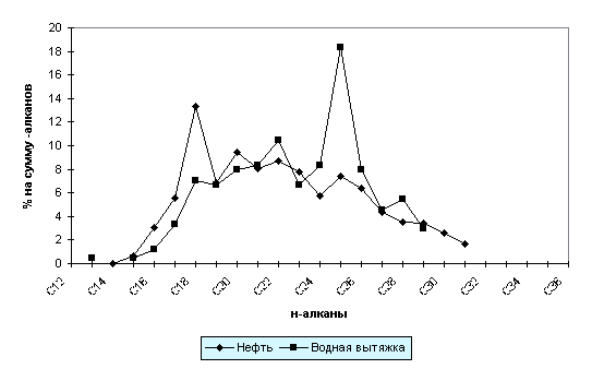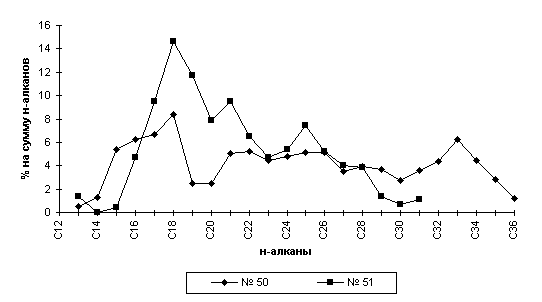 Полученные результаты свидетельствуют о высокой интенсивности процессов биодеградации нефтей в водной среде, и в первую очередь их углеводородных соединений. Этим же, по-видимому, может быть объяснено различие углеводородного состава метано-нафтеновых фракций нефтей и битумоидов водной вытяжки (рис.5,а): если в нефтях основной максимум в распределении н-алканов приходится на С16-18 (30-41% от их суммы), то в водных вытяжках из нефтей - на С24-30 (48-68%), причем в ряде случаев фиксируется появление высокомолекулярных УВ (С32-36), отсутствующих в нефтях. Исключение составляют отдельные пробы окисленных нефтей (плот-ность 0.933-0.936 г/см3), отобранные с факельных площадок, где наблюдается близкий характер распределения н-алканов (рис.5,б).
