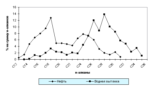 По данным ГЖХ в составе метано-нафтеновой фракции, содержание которой в аквабитумоидах колеблется в пределах 65-78%, преобладают высокомолекулярные н-алканы С24-25 (53-60%) при подчиненной роли УВ С16-20 (14-30%) (рис.2). Максимальное содержание низкомолекулярных н-алканов фиксируется в пробах, несущих признаки органического загрязнения (ХБА - 2.7-5.5 мг/л, НП - 0.44-0.5 мг/л).