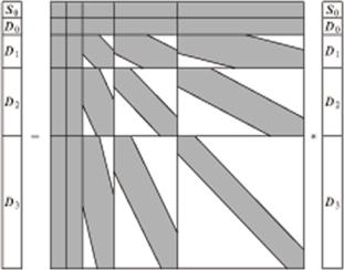Различные уровни оказались полностью развязанными, потому что в матрице теперь полностью отсутствуют блоки, которые ранее перепутывали их. Блок с SS-элементами извлечен, а на его место вставлена нулевая матрица. Полная матрица соответстваенно искусственным образом увеличилась. Вместе с ней увеличились и векторы, характеризующие функции f и g. Теперь здесь удерживаются все промежуточные s-коэффициенты вейвлет-разложения функции f. Каждый блок Sj+1 получается из Sj и Dj. В матрице преобразования равны нулю все SS-элементы за исключением их величин на низшем уровне S0S0. Все остальные SD-, DS-, DD-матрицы почти диагональны вследствие конечности области задания вейвлетов и скейлинг функций. Приведенная на рис. 2 форма функции g преобразуется в ее обычное вейвлет-представление из рис. 1 путем разделения каждого Sj в Sj-1 и Dj-1 стандартным методом. Затем эти Sj-1 и Dj-1 добавляются в соответствующие компоненты вектора. Эта процедура итерируется, начиная теперь уже с Sj-1, вполоть до S0, когда мы приходим к обычному вейвлет-представлению функции g. Таким способом мы избавляемся от всех s-коэффициентов за исключением s0. Вычисления можно теперь проделать очень быстро.