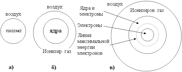 Как же происходит образование ШМ. Предположим, что за счёт подвода большого количества энергии (например, при мощном электрическом разряде), в некотором объёме образовалась плазма (рис.1а.).