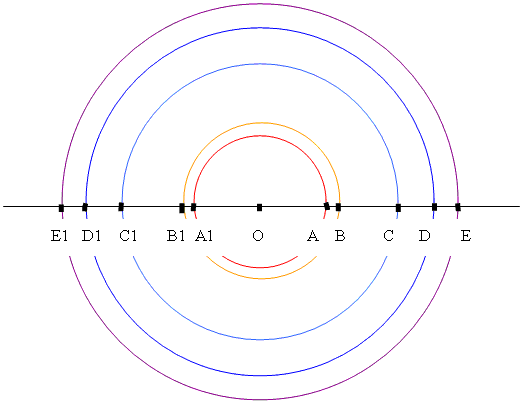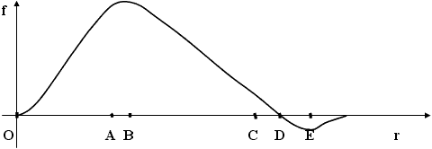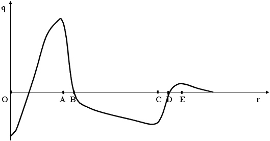 На рис.2 представлен разрез ШМ. Движение ядер и электронов, составляющих ШМ – это колебательные движения под действием электрического поля. Все ядра, т.е. практически вся масса ШМ, находятся внутри коричневой сферы с точками В1 и В. В объёме, ограниченном красной и коричневой линиями энергия ядер равна нулю. При движении к центру ШМ ядра ускоряются, приобретая в центре максимальную энергию. Двигаясь от центра они замедляются до нулевой энергии в промежутке между точками А и В. Такое движение положительно заряженных ядер обусловлено центральным отрицательным зарядом. Теперь рассмотрим движение электронов. Они имеют максимальную энергию на сфере с точкой В, а нулевую энергию в центре ШМ между синей и голубой линиями (линии с точками С и D), т.е. электроны ускоряются от точки D до точки В, после чего замедляются при движении к центру ШМ. После этого вновь разгоняются к точке В и замедляются при движении к точке D. Рассмотрим распределение заряда по радиусу ШМ. Такое распределение представлено на рис.3.