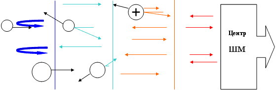 Теперь рассмотрим вопрос, как частицы ШМ взаимодействуют с окружающим её атомами воздуха. На периферии ШМ находятся только электроны и чем ближе они к границе, тем меньше их энергия. Основное взаимодействие с атомами газа происходит в той области, где энергия электронов близка к тепловой энергии. Процесс взаимодействия атомов воздуха с электронами ШМ схематично показан на рис.6.