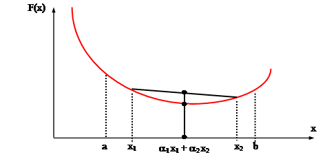 где х1 и х2 – любые две точки из интервала (а,b); a1, a2 ³ 0, причём a1 + a2 = 1.