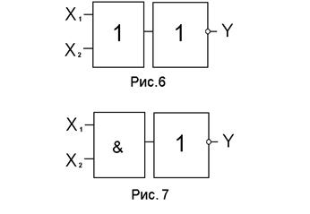 Элемент Пирса можно представить в виде последовательного соединения элемента “ИЛИ” и элемента “НЕ” (рис.6), а элемент Шеффера - в виде последовательного соединения элемента “И” и элемента “НЕ” (рис.7).