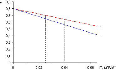 η=η0–КТ* – КПД коллектора, η0 – оптический КПД, T* – приведённая разность температур, К – эффективный коэффициент тепловых потерь, 1 – характеристика коллектора с К1=4Вт/(м2К), 2 – характеристика коллектора с К2=6Вт/(м2К).