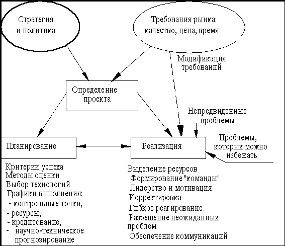 Искусство управления заключается в осуществлении намеченного. В сфере НИОКР, больше чем в какой-либо другой это зависит от людей, входящих в проектную "команду". Творчество и предпринимательство не могут быть спланированы, но условия, в которых они могут эффективно раскрыться, сильно зависят от управленческих решений. Осуществление плана может быть эффективным только тогда, когда он воспринимается как реальный теми, кто отвечает за его выполнение. Поэтому характер и стиль руководства со стороны высшего менеджмента – жизненно важная составляющая успеха проекта.