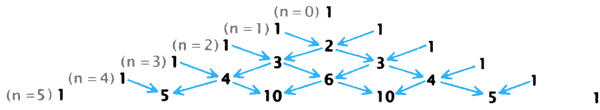 Треугольник Паскаля (вверху) служит для вычисления коэффициентов разложения выражений вида (x+1)n. Начав с треугольника из единиц, вычисляют значения на каждом последовательном уровне путём сложения соседних чисел; последней ставят единицу. Таким образом можно определить, например, что