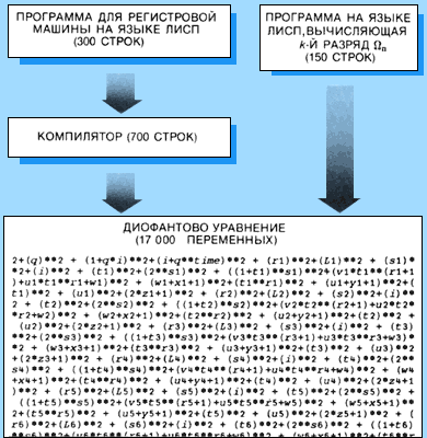 Подав на вход реального компьютера, имеющего программу-компилятор, программу регистровой машины, которая выполняет инструкции на языке Лисп, получим через несколько минут на выходе уравнение длиной около 200 страниц, содержащее примерно 17000 неотрицательных целых переменных. Итак, я могу вывести диофантово уравнение с параметром k, кодирующее k-й разряд Ωn, путём простой подстановки программы на Лиспе (в двоичной форме), предназначенной для вычисления k-го разряда Ωn, в 200-страничное уравнение. Для любой заданной пары значений k и n диофантово уравнение имеет в точности одно решение, если k-й разряд Ωn равен 1, и не имеет решения, если k-й разряд Ωn равен 0.