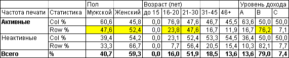 В качестве основной услуги фотосалона было рассмотрено печатание фотографий. Поэтому, большинство вопросов анкеты было сформулировано для подробного исследования именно этого показателя. На основе полученных данных была составлена таблица, согласно которой можно выделить несколько групп потребителей услуг по печати фотографий. В таблице использованы показатели: Col % – процент по колонке – например, процент мужчин, которые являются активными потребителями данных услуг, равен 60,6 (все мужчины принимаются в данном случае за 100%, и считается, сколько из них являются активными потребителями);Row % –процент по ряду – например, процент активных потребителей среди мужчин равен 47,6% (в этом случае за 100% принимаются все активные потребители, и выясняется, сколько из них являются мужчинами).Я специально перевела количественные данные в процентные, чтоб Вы имели представление о рынке фото услуг в целом.