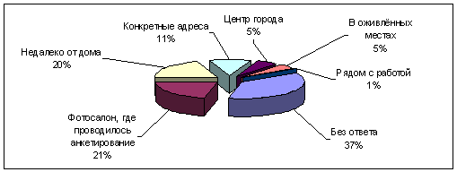 География магазина – важный стратегический аспект не только для фотомагазина. Другое дело, что не всегда удаётся «занять более выгодную позицию» с точки зрения удобства для клиента. Поэтому очень обрадовал результат, согласно которому большинство ответивших респондентов (21%) считают для себя удобным тот фотосалон, где проводилось исследование (то есть, место выбрано верно). 20% считают удобным расположение фотосалона рядом с домом, 11% (в сумме) респондентов указали конкретные адреса.