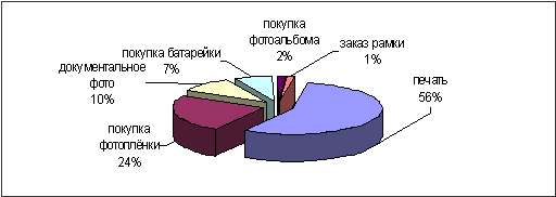 Диаграмма показывает, что основной вид услуг для всех фотосалонов – это печать с негативов (как правило, все фотосалоны включают в стоимость фотоплёнки – проявку, поэтому проявка не была выделена в отдельный показатель). Это характерно для многих, но не всех фотосалонов: некоторые специализируются на виньетках (фотографии с «окошечками» для школ и детских садов), другие позиционируют свой фотомагазин, как фото студию и специализируются на художественных фотографиях.