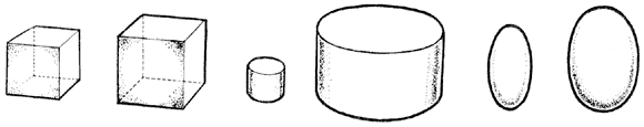 Еще ошибочней бывают результаты сравнительной оценки площадей и объемов. Это тем более неожиданно, что линейные размеры тренированный глаз оценивает довольно точно. Попробуйте угадать, во сколько раз объем куба, изображенного на рисунке справа, больше объема левого куба? Какое соотношение между объемами цилиндров? Эллипсоидов? Минутку, не читайте дальше текст! Сделайте оценку и запомните числа.