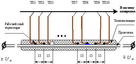 В практике теплофизического эксперимента зачастую возникает необходимость измерять температуру поверхности металлических элементов экспериментальных устройств, по которым протекает электрический ток. Если использовать термопары, рабочий спай которых имеет непосредственный контакт с токонесущей поверхностью, то выходной сигнал термопары в общем случае равен: