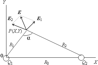 Ниже представлены формулами (2) и (3): расстояния R1 и R2 от зарядов Q1 и Q2 до точки наблюдения P(X, Y); напряжённости E1 и E2, потенциалы φ1, φ2 поля, создаваемые каждым из зарядов в точке наблюдения; объёмная плотность энергии поля W(X, Y), а также полные значения напряжённости E и потенциала φ в той же точке P(X, Y). Здесь же дано выражение для cosα, косинуса угла между векторами E1 и E2. Некоторые величины показаны на рис. 1.