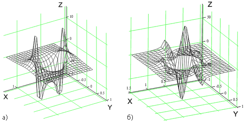 Рис. 4. Объёмная плотность ρ12': а) вычисленная для одноимённых зарядов по формуле (37) в пределах (–0,5 < x < 1,5; –1 < y < 1); б) вычисленная для разноимённых зарядов