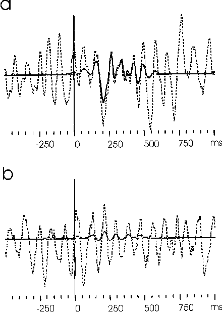Пунктирная кривая v исходная электроэнцефалограмма, сплошная кривая v результат применения предлагаемого метода выделения единичных вызванных потенциалов. Отведение P3 (по системе 10-20%). На этом и последующих рисунках позитивность вниз.