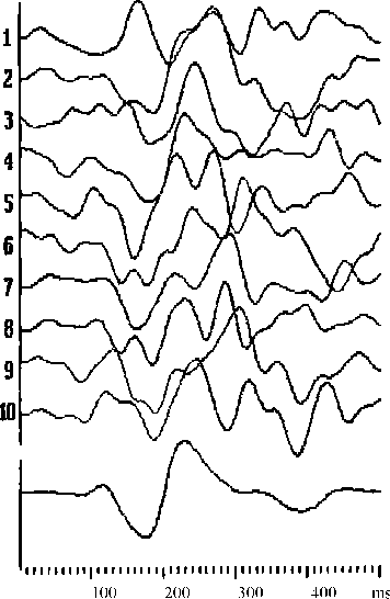 Рис.2. Верхние 10 кривых v единичные вызванные потенциалы, выделенные из первых 10 последовательных реализаций в серии из 75 предъявлений зрительного стимула. Нижняя кривая v усредненный по всей серии ответ. Отведение P3. |