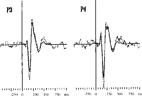 Рис.3. Соответствие форм зрительных вызванных потенциалов, полученных при усреднении выделенных единичных ответов (сплошная кривая) и при традиционном усреднении исходных реализаций (пунктирная кривая) в отведения P3 и P4.