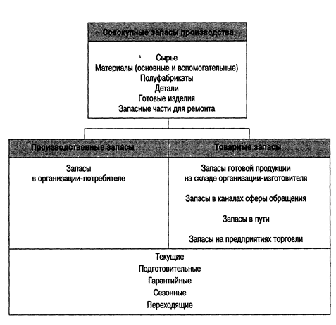 Совокупные запасы производства, как видно из рис. 2, подразделяются на 2 вида: производственные и товарные запасы. Производственные запасы формируются в организациях-потребителях. Товарные запасы находятся у организаций-изготовителей на складах готовой продукции, а также в каналах сферы обращения. Запасы в каналах сферы обращения разбиваются на запасы в пути и запасы на предприятиях торговли. Запасы в пути (транспортные) находятся на момент учета в процессе транспортировки от поставщиков к потребителям.