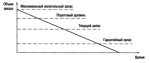 Пороговый уровень запаса используется для определения момента времени выдачи очередного заказа.