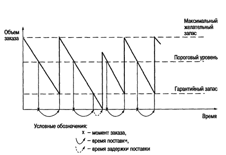 Гарантийный (страховой) запас позволяет обеспечивать потребность на время предполагаемой задержки поставки. При этом под возможной задержкой поставки подразумевается максимально возможная задержка. Восполнение гарантийного запаса производится в ходе последующих поставок через использование второго расчетного параметра данной системы - порогового уровня запаса.