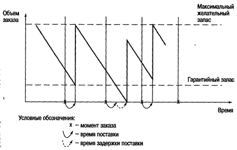 Гарантийный (страховой) запас, позволяет обеспечивать потребность на время предполагаемой задержки поставки (под возможной задержкой поставки также подразумевается максимально возможная задержка). Восполнение гарантийного запаса производится в ходе последующих поставок через пересчет размера заказа таким образом, чтобы его поставка увеличила запас до максимального желательного уровня. Графическая иллюстрация функционирования системы управления запасами с фиксированным интервалом времени между заказами представлена на рис. 5.