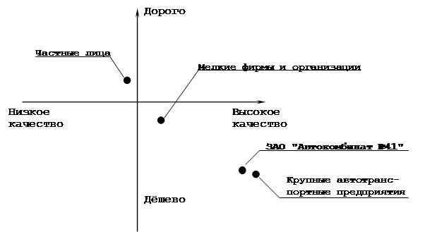 Предприятия стремятся к тому, чтобы их услуги были по качеству выше чем у конкурентов, а по расценкам ниже. На графике отмечены соотношения цены и качества ЗАО "Автокомбинат №41" и трёх основных групп его конкурентов.