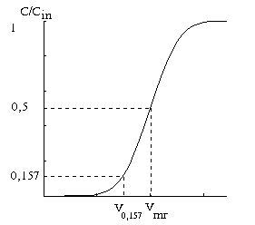 Что мы должны преобразовать в этой формуле, чтобы получить формулу для расчета эффективности для фронтальной хроматографии? Прежде всего, следует найти такой участок на фронтальной кривой, который был бы равен s0/(5,545)1/2 , так как этот шаг позволит ликвидировать коэффициент 5,545. Используя нашу новую формулу, несложно найти С/Сin при x= ±1/(5,545)1/2. Полученная величина составляет 0,159, поэтому